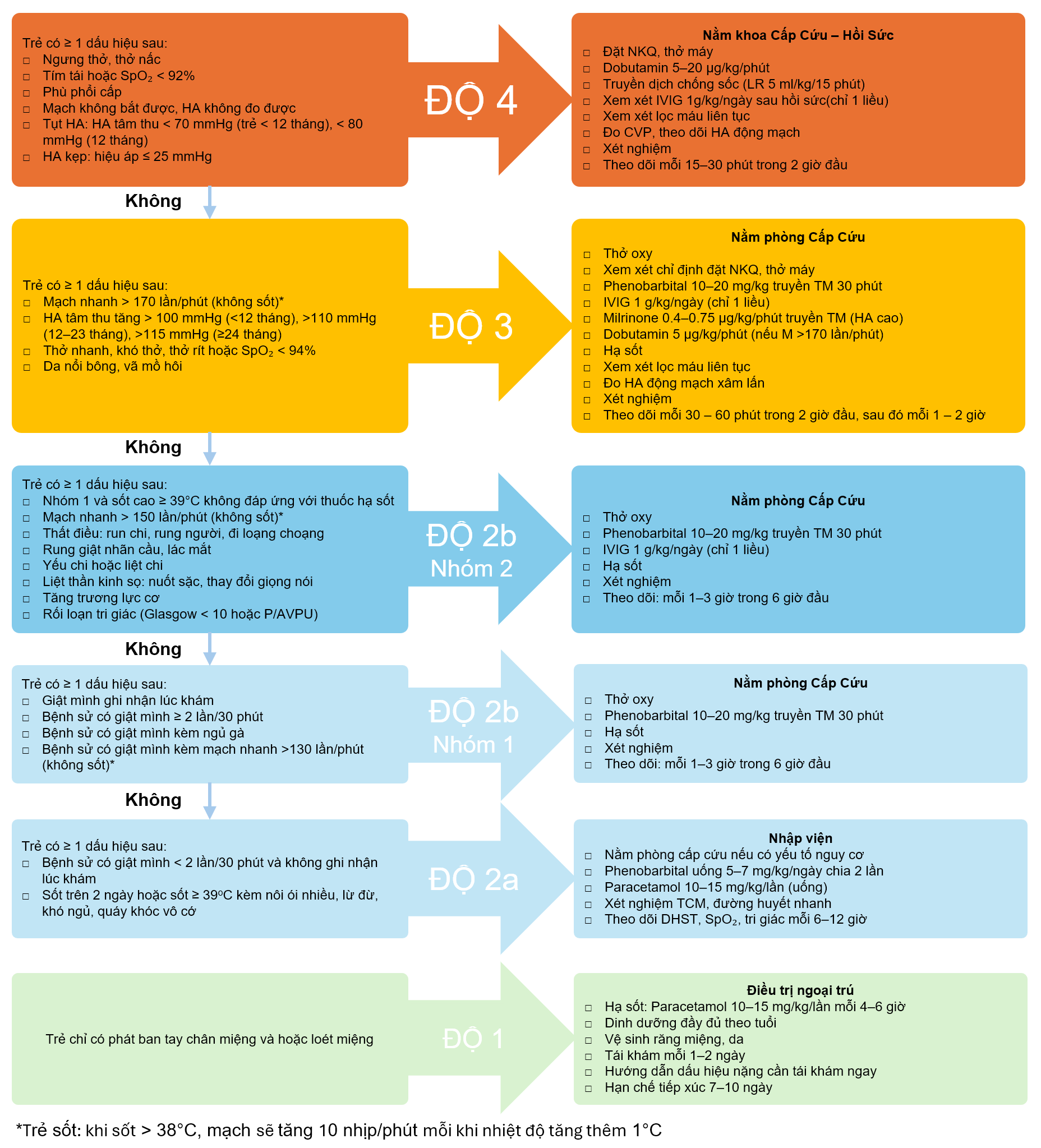 - Độ 2b(Tay chân miệng có biến chứng thần kinh nặng): Điều trị nội trú tại bệnh viện tại phòng cấp cứu hoặc hồi sức