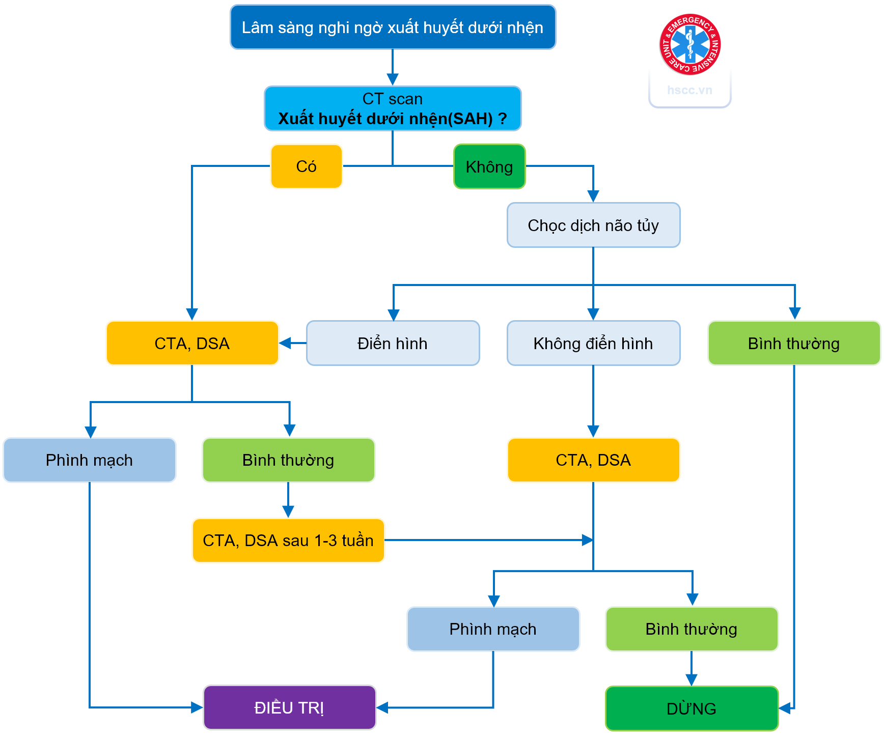 - Cắt lớp vi tính sọ não không tiêm thuốc cản quang hoặc cộng hưởng từ não mạch não: có hình ảnh của máu trong khoang dưới nhện