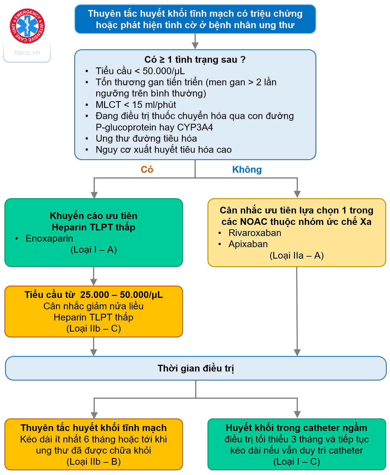 | Cân nhắc giảm một nửa liều Heparin TLPT thấp khi điều trị TTHKTM ở BN ung thư có số lượng tiểu cầu từ 25 - 50.000/µl | IIb | A |