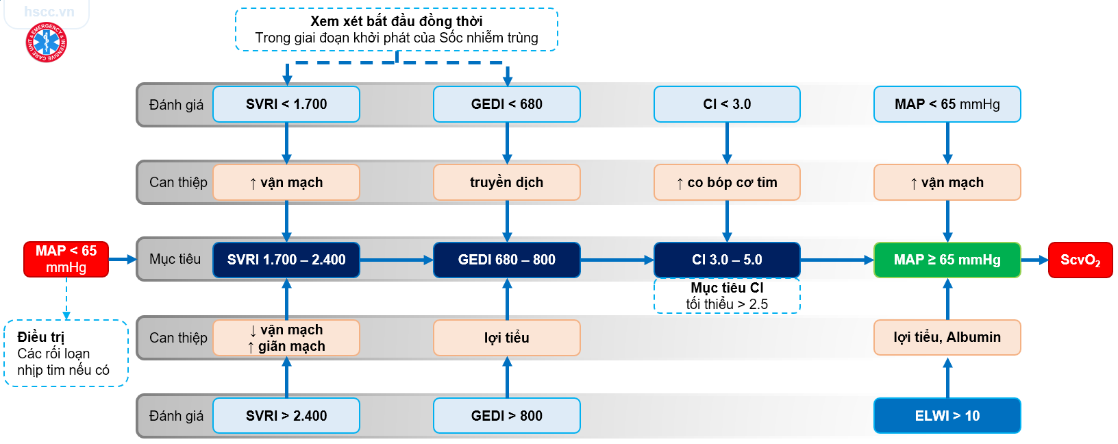 Mục tiêu MAP ≥ 65 mmHg, CI > 3.0 L/min/m2 và ScvO2 > 70%