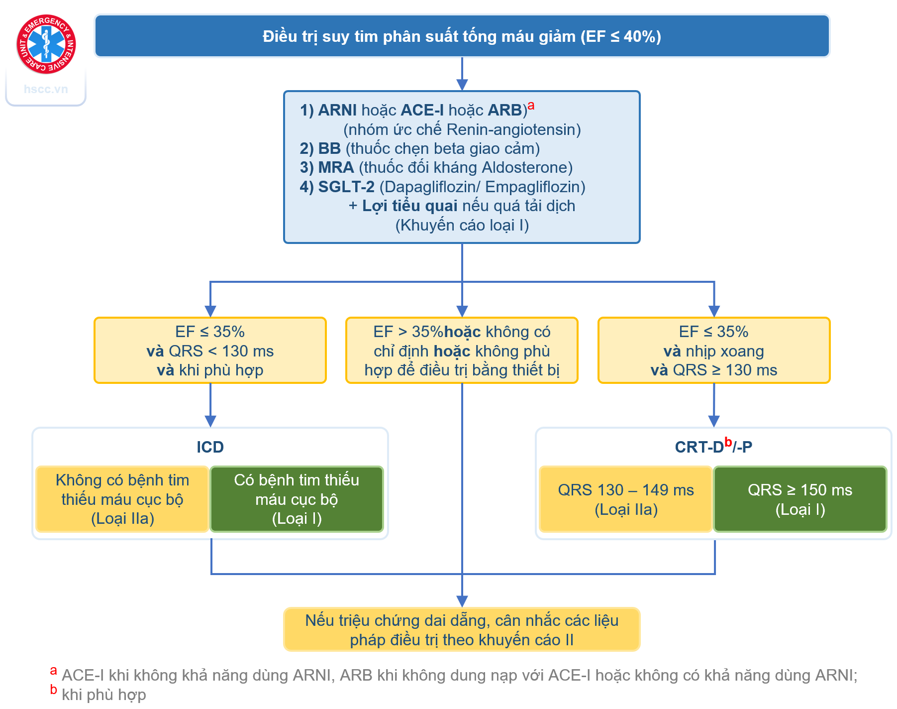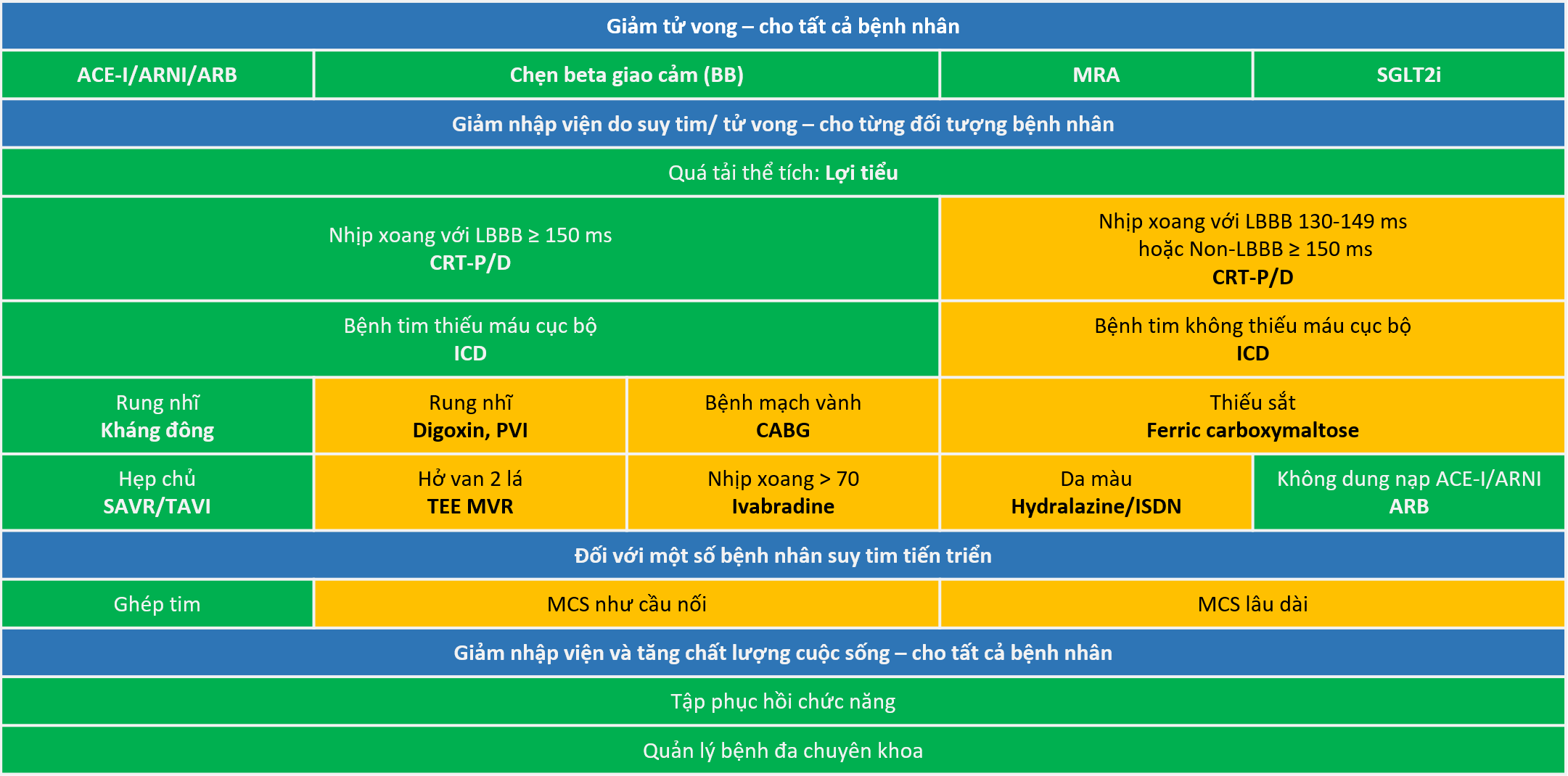 Chú thích: ACE-I: thuốc ức chế men chuyển; ARB: ức chế thụ thể angiotensin; ARNI: ức chế thụ thể angiotensin/neprilysin; CRT-D: tạo nhịp tái đồng bộ tim kèm chức năng khử rung tim; CRT-P: tạo nhịp tái đồng bộ tim không kèm chức năng khử rung tim; ICD: thiết bị khử rung tim tự động cấy vào cơ thể; ISDN: isosorbide dinitrate; LBBB: blốc nhánh trái; MCS: hỗ trợ tuần hoàn cơ học; MRA: thuốc kháng thụ thể mineralcorticoid; PVI: cô lập tĩnh mạch phổi điều trị rung nhĩ; SGLT2i: chất ức chế đồng vận chuyển natri-glucose 2; SAVR: phẫu thuật thay van động mạch chủ;TAVI: thay van động mạch chủ qua catheter; TEE MVR: sửa van hai lá bằng kẹp hai bờ van qua đường ống thông.