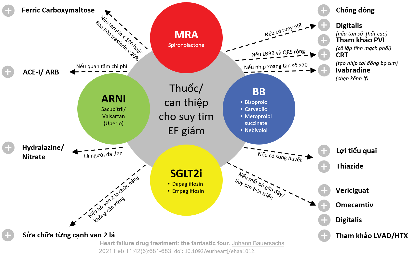 - Các nhóm thuốc nền tảng (còn gọi là các nhóm thuốc “trụ cột”), bao gồm: (1) Nhóm ức chế hệ renin-angiotensin bao gồm ức chế men chuyển (ACE-I) hoặc ức chế thụ thể angiotensin (ARB) hoặc ức chế kép neprilysin và angiotensin (ARNI); (2) Chẹn beta giao cảm; (3) Thuốc đối kháng thụ thể mineralocorticoid hay kháng aldosterone (MRA); và (4) Ức chế kênh đồng vận chuyển Natri-glucose 2 tại ống thận (ức chế SGLT2) giúp giảm tử vong, giảm nhập viện vì suy tim, cải thiện triệu chứng suy tim ở người bệnh suy tim có phân suất tống máu giảm.